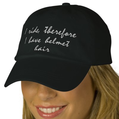 Just like all of you, I don't like having helmet hair. But it comes with the territory. With all the solutions out there and trying stuff that didn't work, or were too much of a hassle, I found a way to have fun with it and don't let it bother me anymore. I created my own baseball cap/hat with the text "I ride, therefore I have helmet hair". My husband loved it and now has one too with "She rides, therefore I love her helmet hair". Helmet off, cap on, and no worries... just fun! Cause that's what riding is about, right? :-)