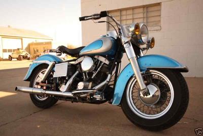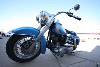 After constant frustration at only being able to ride when the guy was ready, I bought my own bike, then dumped the guy. He is a 1975 Electra Glide, mostly stock. I love the big fat look of the front end, cowling, and fenders. It has an awesome fat solo seat that has lots of spring. I put wider handlebars on it to make it more comfortable to ride. It is not a bike you lay back on, but sit atop, making it handle beautifully and letting the rider feel in complete control. Just had the top end redone on him and he's ready to go!